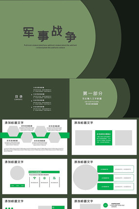 1、专业性:国防军事PPT模板的设计应体现军事特色,涵盖军事理论、武器装备、战略部署、作战指挥等方面,模板中的图片、图表、配色等应体现军事元素的独特性,如使用军绿色、蓝色等主题色,以及军事标志、徽章等图案。